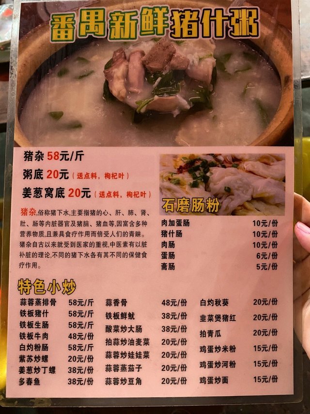 番禺新鲜猪杂粥 (增南路) (广州) 网址: https://s.openrice.com/KtLS0m0Q0yy00 地址: 广州荔湾区芳村增南路30-32号铺 电话: +86 13539108939