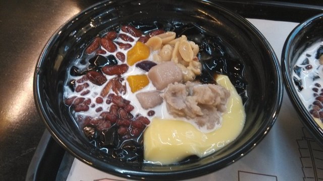 点的芋圆二号,菜单标价16元。但是上的好像不是我点的那样,没有珍珠。我个人超喜欢珍珠的,不过是爱抢购的活动,花了三四块钱秒的,店员态度很好,所以费事说了,不过味道不错,都是真材实料,厚厚的凉粉和布丁底,上面是芋圆和几种豆豆类,豆都清清甜甜粉粉的。不像有些店冰沙底,份量很少。这一碗我和BB吃完都饱了。…查看更多