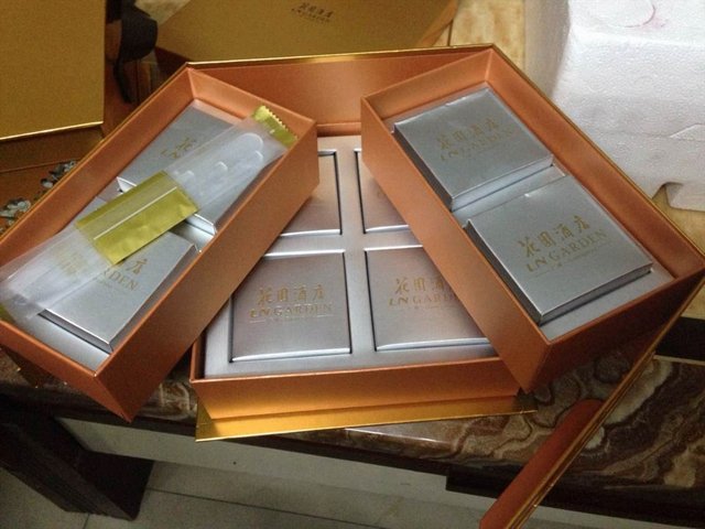 花园酒店环境当然是一流了!装修高档大气!~          拿月饼券去换的~~服务员态度很好~很热情~会想我们介绍各种月饼及其特色。最后知道我们是用饼券的也没有不高兴的意思~         最喜欢这盒子了~盒子很漂亮~~做得精致美观~月饼吃掉盒子还可以做首饰盒~~!月饼外观很好看精致~月饼油水足~莲蓉甜而不腻~蛋黄很香~很甘~口感不错!!~查看更多