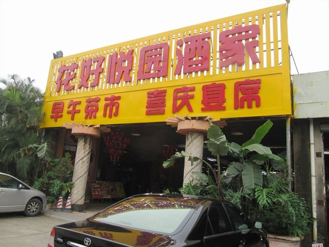 五、六年前已到花好悦园吃饭,当时他家的环境较简陋,是那种临时搭建的大棚,下雨时有些地方还漏雨,但是他家的出品位的不错,价格非常实惠。近期又去了一次花好悦园,已经鸟枪换大炮了,门面装修的不错,面积也扩大了,除了大厅还有房间。那天中午,和几个朋友过去。一进大门,左手边有个大厅,环境不错,但是没有开,走进去,是海鲜池,和开放式厨房;开放式厨房前摆着出品,直观感很强,可以供顾客点菜时挑选。再往里走是靠近荷花池的大厅和房间。我们靠近荷花池找了张大台。服务员很快开了茶,并送上菜单。他家的菜品价格在30-50元的居多。五杯猪手  38元  较大碟,猪手切得很大块,汁是酸甜的,吃起来不够淋,不够入味,有点油腻。家乡碌鹅 43元 碌鹅焖得比较香,也较入味,不过比较硬。白切鸡 40元半只   不过不失,鸡质还可以,有嚼头,鸡肉较滑,吃起来还是比较嫩。新塘鱼包浸菜苗  30元  鱼包比较鲜甜,菜苗也很嫩,这个菜还可以。大良炸牛奶 28元  卖相不错,色泽金黄,但是炸得老了点,吃起来奶香不够浓。了米不够滑腻。顺德酿鲮鱼 38元  卖相不够好,煎得有点焦,鱼肉不够鲜嫩,咸了点。炒斋面 23元  碟头一般,炒得较干身,味道较咸。金菊卷 14元半打  样子有点像蜂巢糕,吃起来不很甜。姜埋奶  6元  这个价格比较实惠,可以和街边糖水铺比美。较大碗,比较滑,姜味浓。芝麻糊6元   比较稠,比较滑,芝麻味道很浓。加上茶位,买单303元,人均60元。总的来说 花好悦园比以前漂亮了;出品还是较粗糙,味道比不上从前;分量还够大;价格没有以前实惠,不具有优势;服务还可以。不值得专门过去品尝。查看更多
