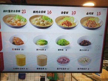 招牌鲜肉云吞面 / 鲜虾蟹籽云吞 / 海鲜汤料包 / 云吞拼盘 / 现榨绿豆饮 / 现榨红豆饮