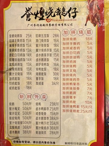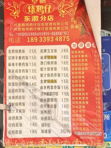 誉煌烧鹅仔 (东漖肉菜市场综合市场) (广州) 网址: https://s.openrice.com/KtLS0m0My8wW0 地址: 广州荔湾区芳村东漖南路46号东漖肉菜市场综合市场1-2号铺 电话: +86 020-80923796