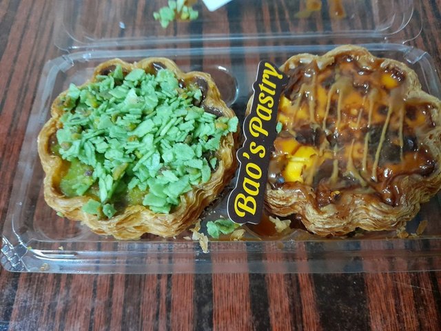 女同事PM噚日(20-3-2025 Thur)中午,送嚟佢喺廣州出trip返嚟嘅手信。睇睇,係呢間嘅蛋撻,一個係法式可頌焦糖,一個應該係開心果味。我拎返屋企,食完晚飯,等老公返嚟至一齊食,一打開就嗅到香味,切開睇,前者餡料係黃色,後者係淺綠色,喺切嘅時候聽到咯咯聲,佢嘅酥皮仍脆,我先食法式可頌焦糖,酥皮薄脆,焦糖蛋漿唔太甜,酥皮牛油味都仍有。而開心果味亦係有,但濃淡得宜,亦唔太甜,不過唔知重欠咩嘢,令我唔可以俾滿分。食完覺得都好飽。…查看更多