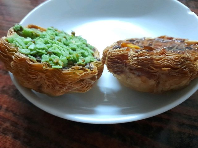 左:開心果味蛋撻,右:法式可頌焦糖蛋撻