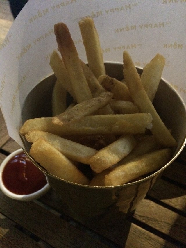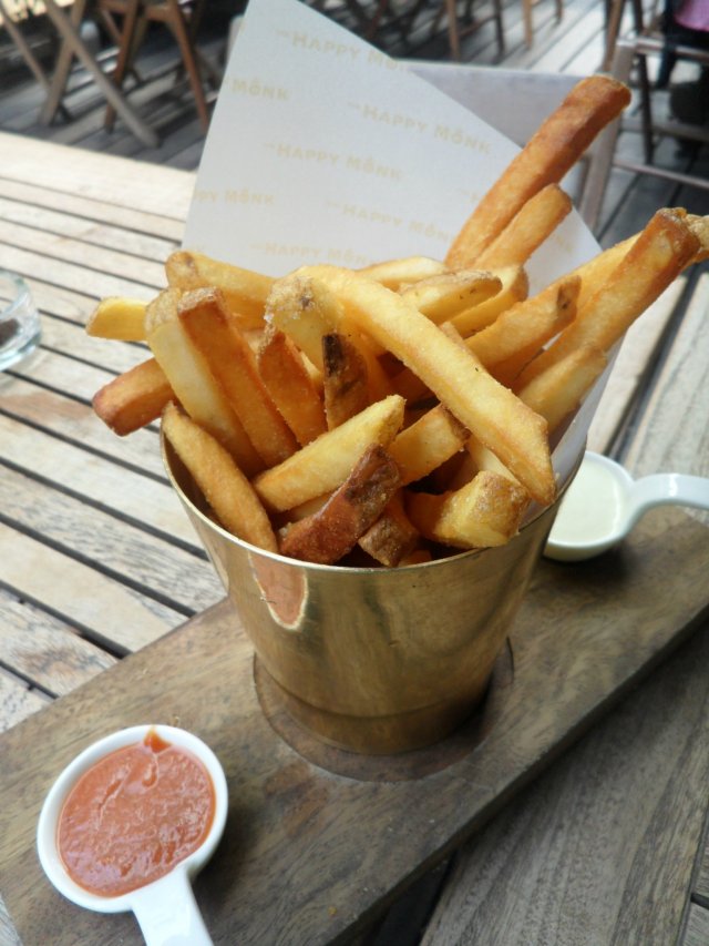 The happy Monk是一家气氛挺好的酒吧,露天环境很不错~就是人比较多,有点吵杂。点了份薯条,是用桶装上了的,很好吃,蘸着他家的酱料来吃很好吃。白葡萄酒海鲜意粉分量刚刚好,意粉有点硬,海鲜味很浓,不过酱汁稍微稀了点,总体口感比较清爽~吃完不会很腻。价格还行,适中吧,毕竟环境和食物质量在那里。查看更多