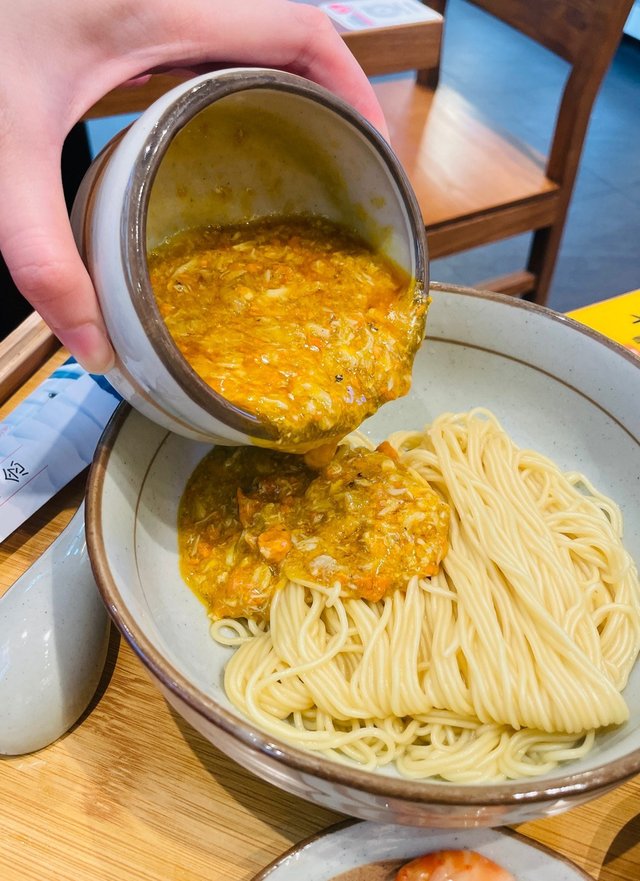 麵身細膩幼滑又不失彈性,口感滑順。將一整碗黃金蟹黃、蟹肉倒下,鋪滿了撈面,真是萬分誘人!蟹肉的鮮甜與海味在每一口中都能感受!