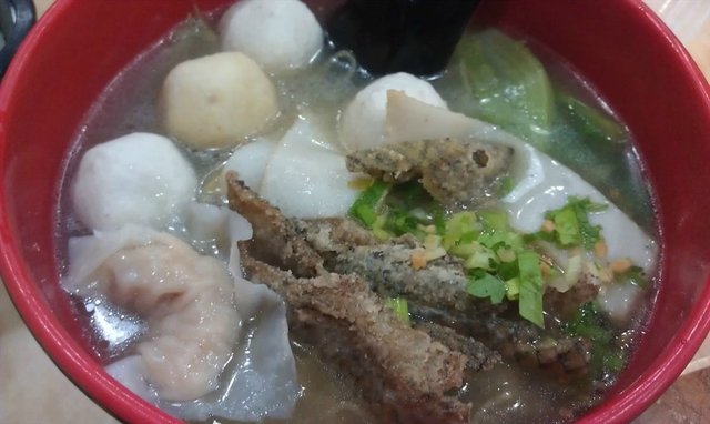我叫了一个杂锦鱼蛋粉,朋友要咗一个牛丸鱼旦粉,外加了一个鱼皮。