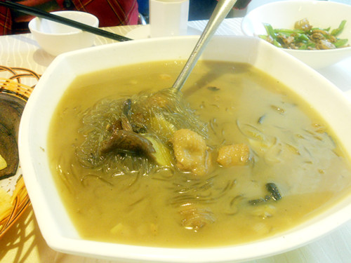 我俩点的土鸡农家炖,小炒肉,葱油饼 加2碗饭,装菜的碟很大,乍看上去土鸡炖的份量也还可以,但实际上大部分是粉丝,鸡肉不超过8块,而且有头颈,汤很鲜,小炒肉也是青辣椒比较多,花肉很少,而且有点咸,葱油饼很好吃,新鲜热辣上来的,很香,饭很坑爹,3元一碗,应该说是一碟,而且是很小的那种,一口都能吃完的。茶位要收3元的。