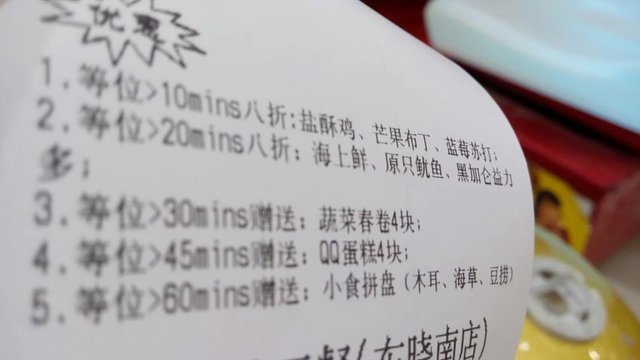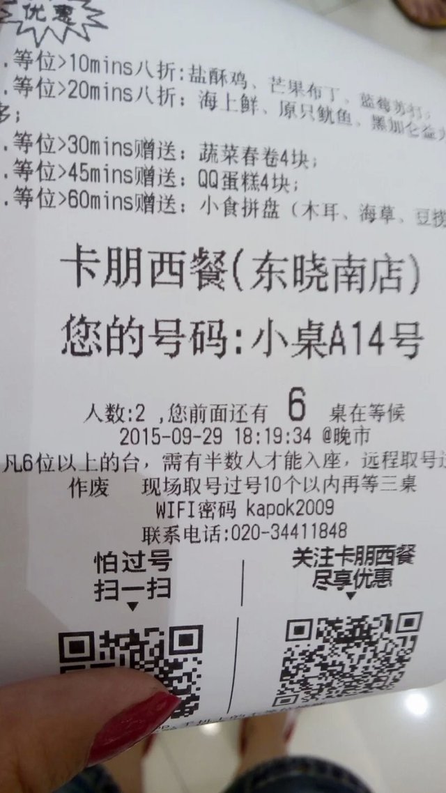 晚上六点多拿号,前面有6桌,但是等了超过30分钟。原来卡朋等位时间越久就越多优惠,毕竟它家是没有团购什么的,就会员优惠和等位优惠。等位超10分钟,盐酥鸡、芒果布丁、蓝莓苏打八折;等位超20分钟,海上鲜、原只鱿鱼、黑加仑益力多八折;等位超30分钟,送蔬菜春卷4块;超45分钟,送QQ蛋糕;超60分钟送小食拼盘。而且以上优惠是同享的。