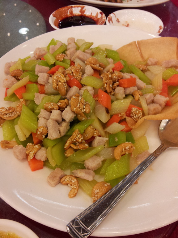 炒丁,里面有腰果、核桃、红萝卜粒、芹菜粒和肉粒等,色彩上好吸引。吃起来清清爽爽爽的,味道不错。