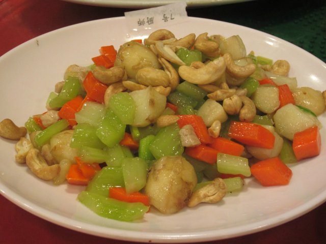 期间,服务员说雀巢腰果丁的雀巢没有了,只有炒腰果丁,我们也觉得没关系。炒丁里有马蒂、红萝卜、西芹和腰果,就是没有肉,真的囧哇。马蒂切得比较大颗,显得有点格格不入哇,不过算是今晚味道不错的菜式了,唉。