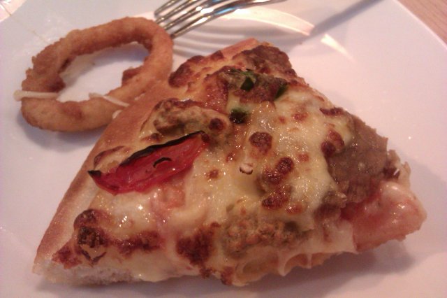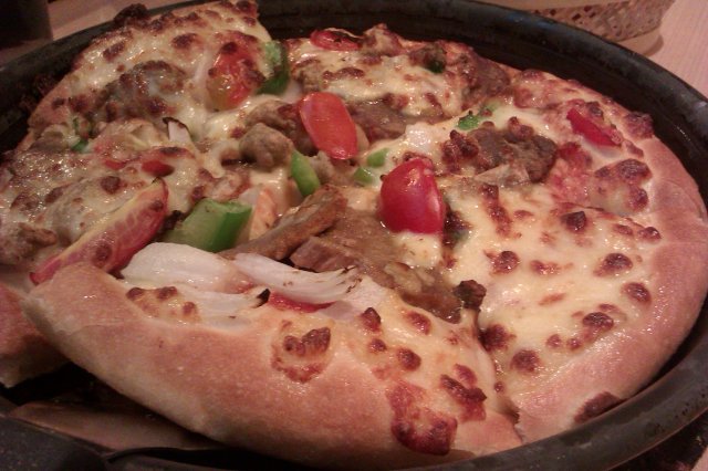 德克萨斯风情小牛排Pizza普通装半价¥34.5,pizza选用小牛排肉,加入德克萨斯风味酱调调味,铺满在pizza面上既小牛排肉粒,口感鲜嫩多汁,pizza中加入左番茄、青椒等中和了pizza既油腻感,让人感受到浓浓既美国西部牛仔风情。