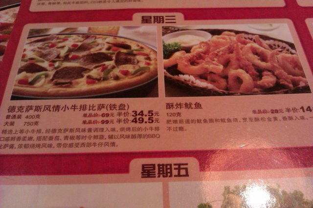 星期三既天天半价两款食物系德克萨斯风情小牛排Pizza(普通装半价¥34.5,大装半价¥49.5)&酥炸鱿鱼(半价¥14)。我地刚好两人可以点今日既两款半价食物,因为半价优惠既系规定一人只能点一款,朋友话想饮热汤,中点左份上选精炖牛肉汤。