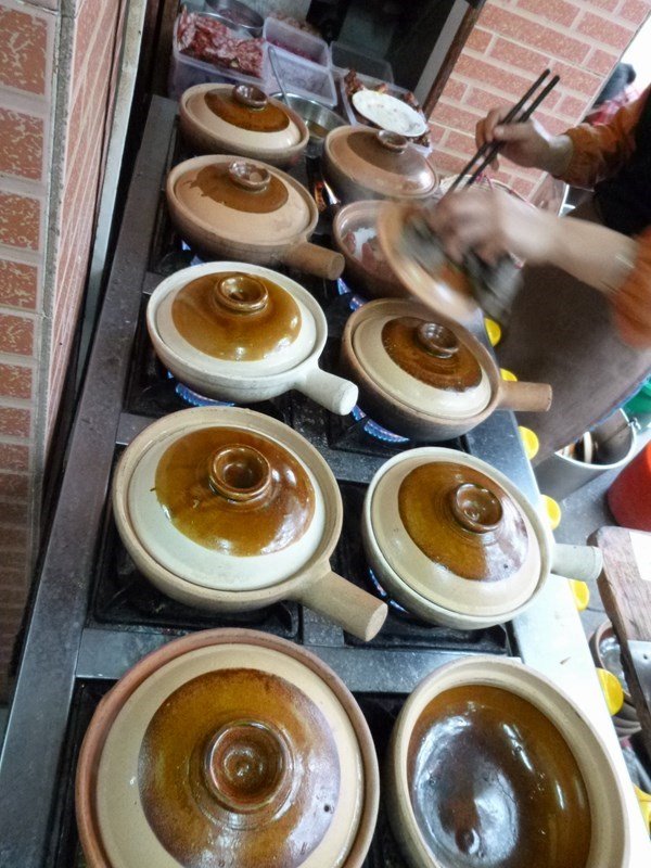 煲仔饭用沙煲仔来做,店门口一排煤气炉同时开火,泡好的米和各种配料放在旁边,即点即做,品种还是比较多的,腊味、排骨、鱼腩、咸鱼之类基本都有,几个阿姨对于火候的控制还是不错的,但还是要看当时阿姨的心情了,煲仔饭还是要有心机才行。