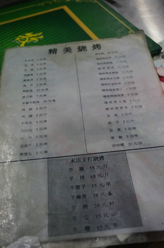 加座,坐下来,好不容易上了个茶,接到服务员甩过来的菜牌,心理凉了半截。忙是可以理解的,不过用甩菜单的态度对待客人这是不可原谅的,坚决曝光!!其他服务同样坑爹了,服务员不算特别少,不过貌似很忙也不知道忙什么,加个水要叫好几个人,一个人还要叫上两次才得,如果不是要拿进去厨房加,估计我们早就会自助。不然真的很容易渴S的。除了老板比较健谈,切羊肉比较熟手外。其他的服务生真心一般….看了菜牌主打烧烤和羊肉套餐,羊排68元/斤,羊腿58元/斤。还有148元一锅的羊一锅、48元的羊杂汤~ 价格还是过得去,不算很贵。