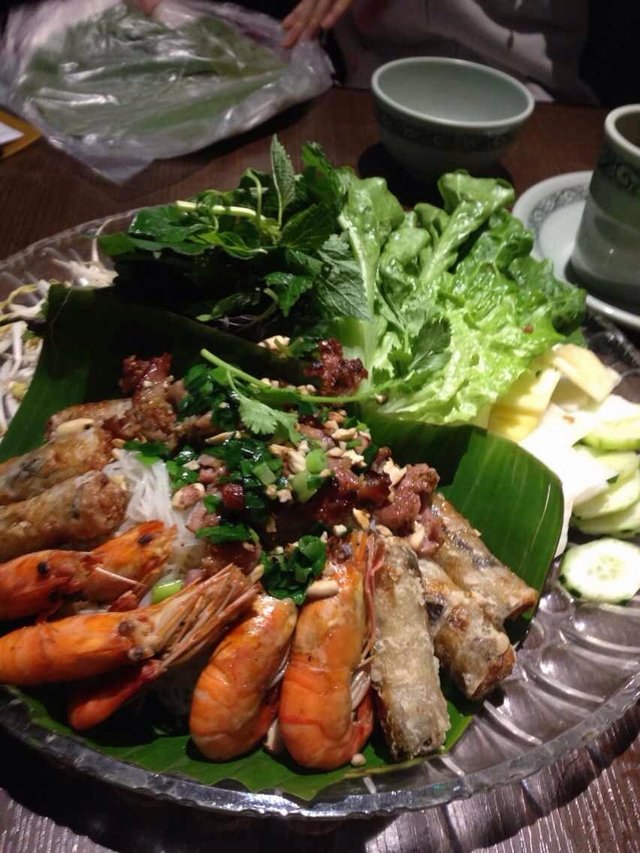 一楼那家实在是太多人了,等了很久也没等到位子。后来服务员说八楼有位置,我们就上去了,明显这里比楼下少人,味道没试过一楼那家就不好评论了。八楼这里我觉得味道还可以耶!我本身喜欢吃咖喱的,觉得这里的咖喱挺不错。还有这个越南的春卷,很不错!一个拼盘,里面有好几样东西,其实是用那张皮包着来吃,因为皮太爆了只好分开吃!分开吃也是很不错的。酸萝卜好吃呢。