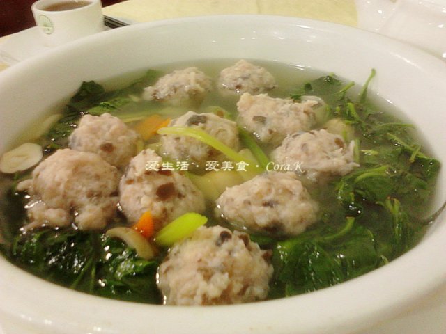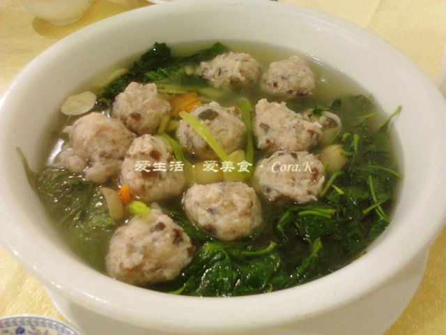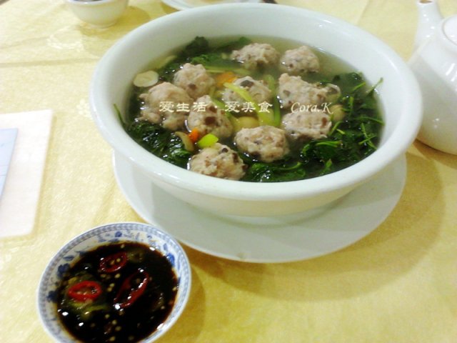 十几分钟后,住家手打肉丸浸枸杞叶上桌了,竟还随了一碟辣椒酱油,卖相还不错,可惜手机拍不出效果。汤算是比较清鲜的,枸杞稍嫌老了些,略带些涩味,早知还是按推荐的浸菜心好些呢。肉丸是出彩的,没有过多的粉,实实在在的手打,肥瘦的比例调配得不错,因加入了木耳一同打制,更增加了肉丸的爽滑口感,不蘸酱油是清清淡淡的原汁原味,蘸了稍带些许辣的酱油却凭添了另一番鲜味,确实值得推荐!