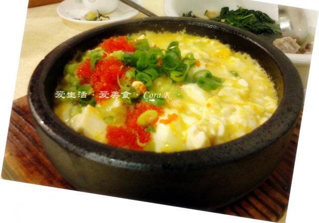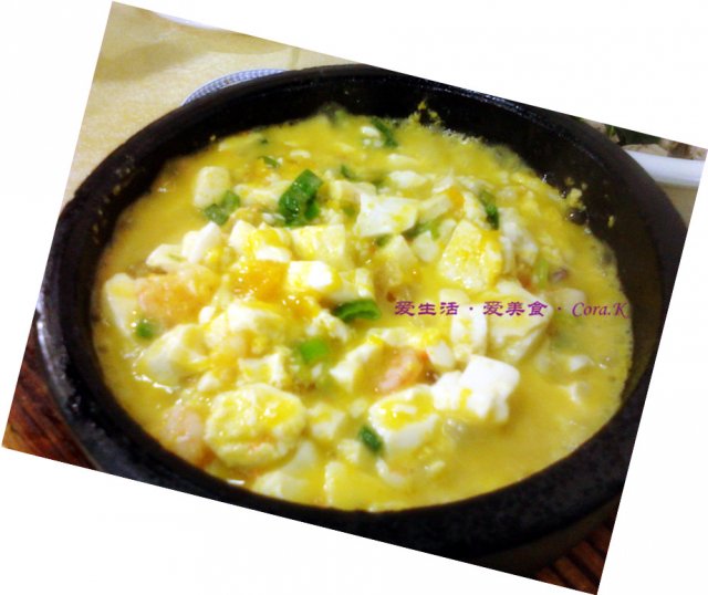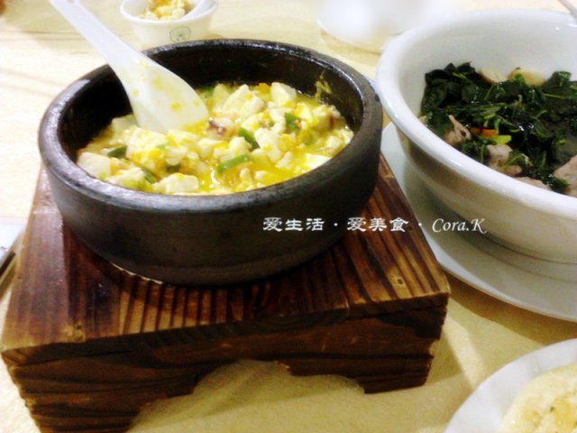 当传菜端着一个滋滋作响热气腾腾的石窝走来,我便知道那是我一眼相中的石窝金瓜海鲜豆腐来了,石窝的大小与我想像中稍有差距,袖珍了些,不过内里的分量和内容却不容小觑。首先卖相好漂亮,整个豆腐窝呈奶黄色,粒粒饱满金灿灿的新鲜蟹籽堆积在石窝一隅,引诱着我们品尝,快速的拍了照,趁着窝的热度将蟹籽伴匀,一边伴一边细数着食材种类,金瓜、豆腐、虾仁、鲜鱿、海参以及还有一种竟然吃不出是什么的海鲜,食材全部切成小粒以便入味,金瓜的粉甜、海鲜的鲜甜全都融入了嫩滑的豆腐中,混合着卜脆的蟹籽,软、滑、绵、甜、脆在口腔中融合碰撞着,着实令人回味,若然再多加些鲜味些的鱼类则更佳,这道菜如果口味重的人会略嫌淡了些。