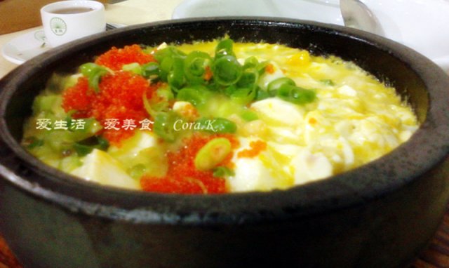 菜牌中的菜式不尽完全,点菜时可以询问一下有没其他做法,价格在芳村来说算是比较贵的,但晚间的上座率却仍然不低,或许因为菜式有其独到之处吧,两个人的菜不太好点,最后在部长的推荐下,点了一份石窝金瓜海鲜豆腐(特价28元)、住家手打肉丸浸枸杞叶(32元)和半打香煎葱油饼(13元),原本是想点萝卜糕的,被告知萝卜糕的胡椒味会比较浓,如果接受不了会觉得不好吃的,于是作罢。