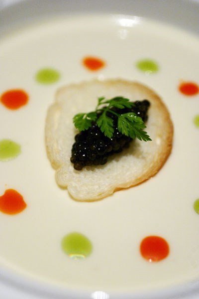 冷花菜汤配鱼子酱(88元):很特别的一款冻汤,卖相优雅细致,淡淡的美态一如打扮妥贴的大家闺秀,娴静温婉却不失大方得体。这款冻汤汤体厚实,入口先是绵软油滑继而感受到它的清新冷冽,散发着贵族光芒的鱼子酱在最后一刻并发!品性相当复杂的一款佳作。严重推荐!