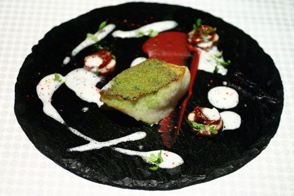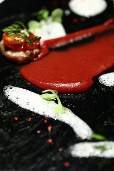 烤银鳕鱼配八爪鱼,油浸番茄,红菜头泥(188元):我认为这是全场最能配合餐厅氛围且最具文艺色彩并拥有相当艺术价值的一道佳肴。出品以一不规则的黑色圆型石板为碟,一块萌达达的烤鳕鱼被置于其中,然后就是大厨浓墨重彩的酱料配菜创作,原色调的大胆、炫丽,看似随意的