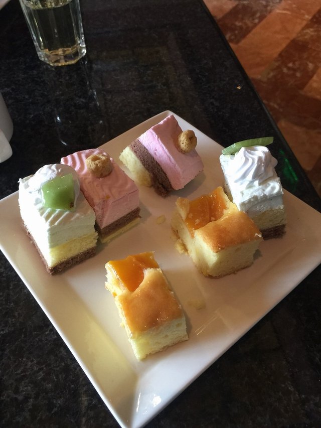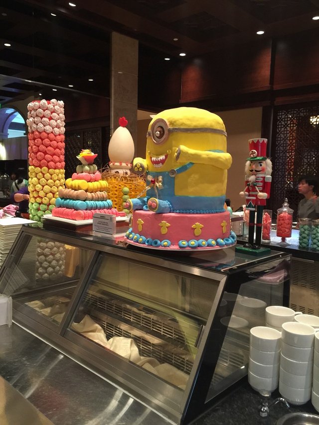 餐廳熱盤區無開,只開甜品區做下午茶(個好像中幅射嘅小黃人好破壞氣氛),剛剛到達有幾團人到達,蛋糕攞晒,大家好怕唔會再添補(領隊有嚇我哋)水果、炸點都大攞一餐,好在之後酒店好快補充!根本唔使心急!