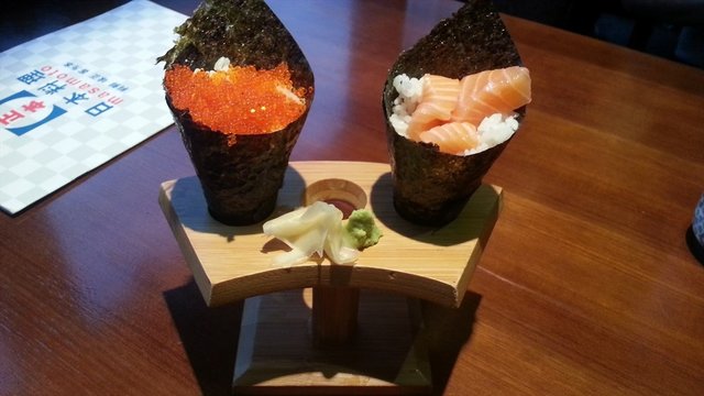 三文鱼手卷+蟹籽手卷:这个卖相挺不错的,分量ok,不过就是价格贵了点,这两个一共都53大洋,手卷的紫菜还是挺新鲜的,三文鱼手卷中的三文鱼分量大概只有3块厚切的,鱼肉也挺新鲜,蟹籽手卷的蟹籽分量很多。总体还不错。
