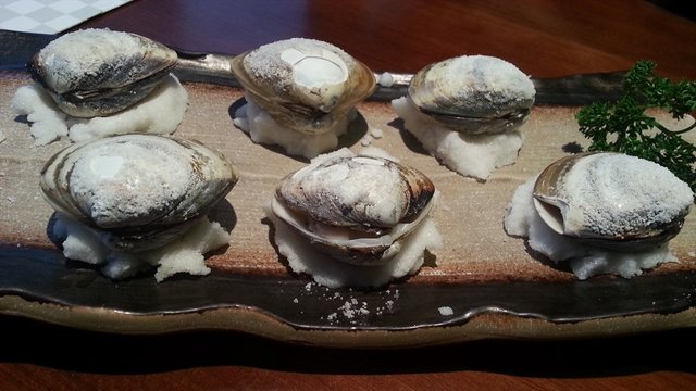 盐烧贵妃蚌:一份只有6个,平均一个就8块RMB,蚌用盐固定住,吃的时候用手拨开上面的盐,里面的蚌吃起来比较鲜,肥美!