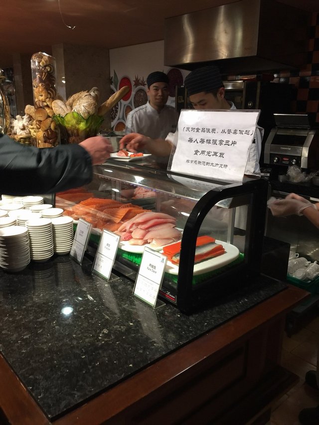 早十分鐘去到餐廳,餐廳仲未放人,夠鐘就攞住晚餐劵入場,我哋坐最近食品區嘅長方枱,不過枱與枱之間好迫,出入都唔方便