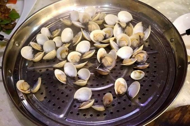 先蒸熟鲜甜的。所以白贝开场。新鲜,只只开口的。