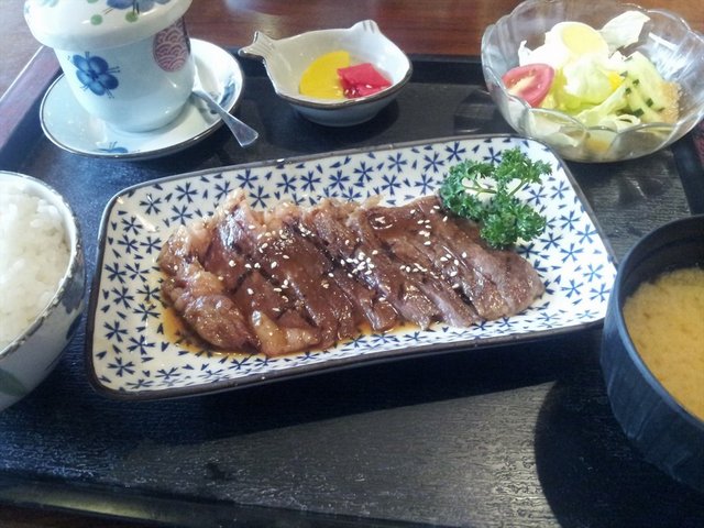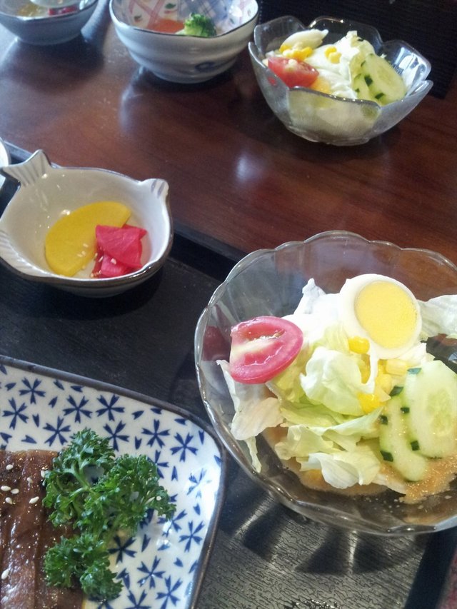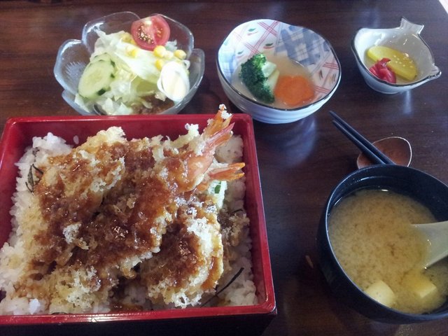 定食搭配的味噌汤、饭、沙律和酱菜,作为午餐来说可谓是非常丰盛。沙律由于千岛酱比较多所以也是偏浓味,而酱菜也是咸的,只有味噌汤是比较清淡的白味噌,感觉这套定食总的来说有些过于重口味。