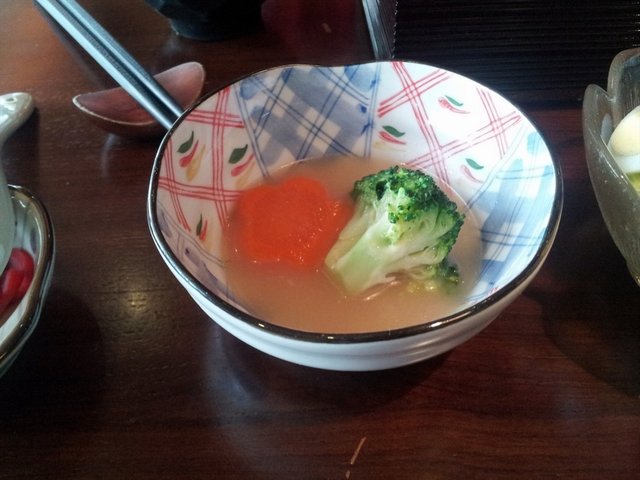 天妇罗定食,相比起来调味上更为合理的组合。天妇罗炸得外脆内酥,而且即使放在米饭上也没有油渍,可见煎炸功夫做得还是挺到位的。附送的配菜也是清灼蔬菜,正适合送炸物下饭。