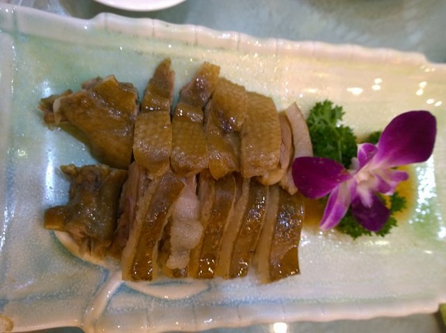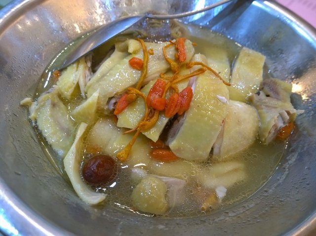 金虫草花水晶鸡 45元 用不锈钢锅上来,隔水蒸出来的鸡,放了虫草花、杞子、红枣之类的。但是因为鸡质不够好,鸡肉不结实,影响了鸡的味道。