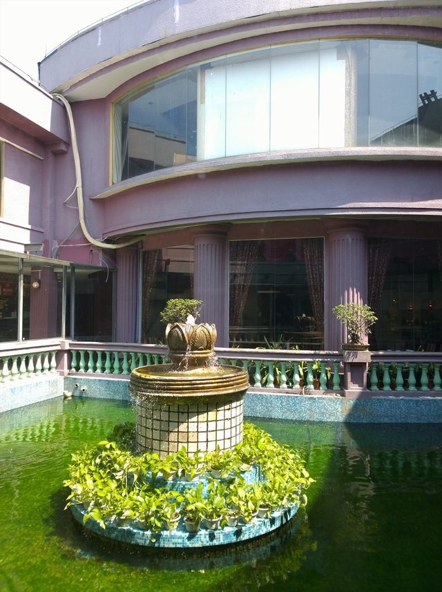 从走廊上,隔着玻璃,可以看到喷水池,里面养了不少金鱼。估计餐厅方面担心小孩玩水导致出事,所以把走廊通向喷水池的门都锁上了。