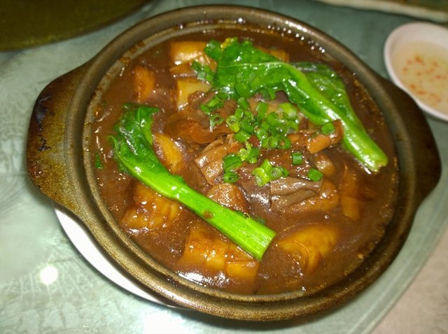 柱侯牛腩啫啫猪肠粉 15元 里面的牛腩不少,焖得很淋很入味;猪肠粉啫得很香,沾着柱候酱吃,味道很好。这个点心属于顶点,很大份,抵吃。。