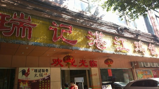 瑞记湛江鸡饭店的招牌很大,远处都能看到。他家是那种升级了的大排档,装修很一般。