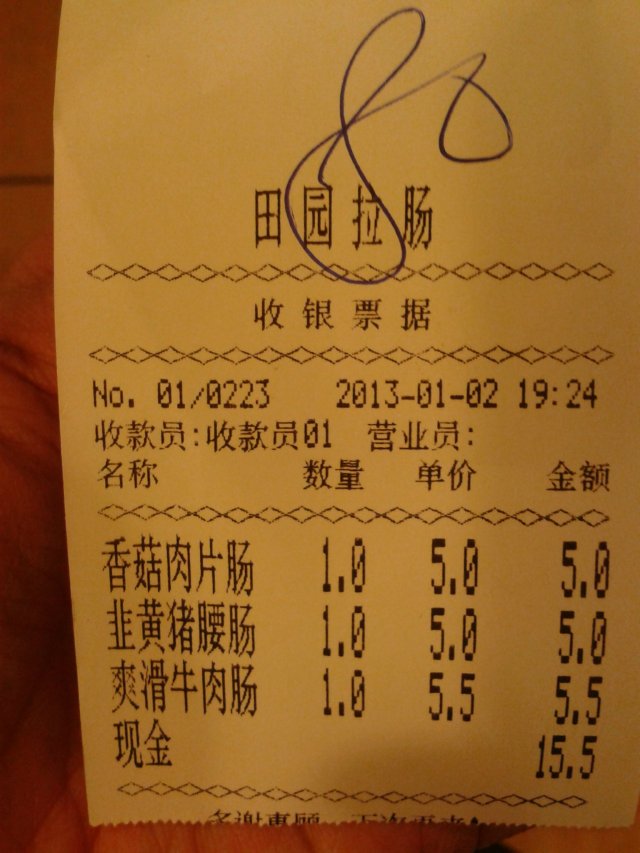 点了猪肉肠、猪腰肠、牛肉肠各一个,其中牛肉肠5.5元,其余两个是5元,炸面一条1元。