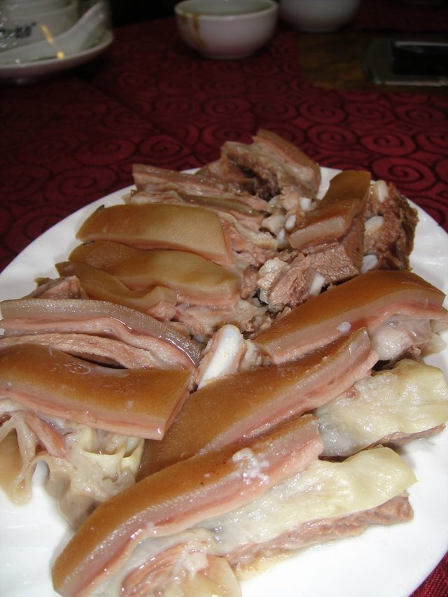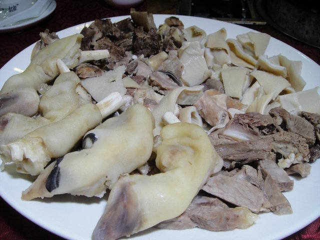 五羊开泰熟肉拼盘:有中份和大份的,中份98元,大份138元。分别有羊展肉、羊肉、羊肚、羊靴、羊上杂。这些都是经过加工的,下煲后煮约10分钟便可以食用。个人比较喜欢羊肚,因为爽口弹牙,有嚼头。