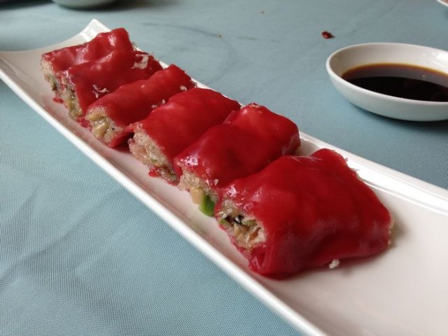 紅米腸,首先腸粉皮係癡牙的..裡面有炸面,菌菇若干,除了腸粉比較差,整體味道還可以。起碼係新鮮嘅