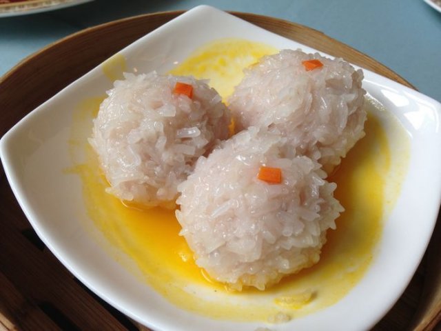 金瓜肉球,係用糯米包裹住豬肉餡在沾上金瓜汁,肉餡好鞋。糯米一撇咁,好奇怪!