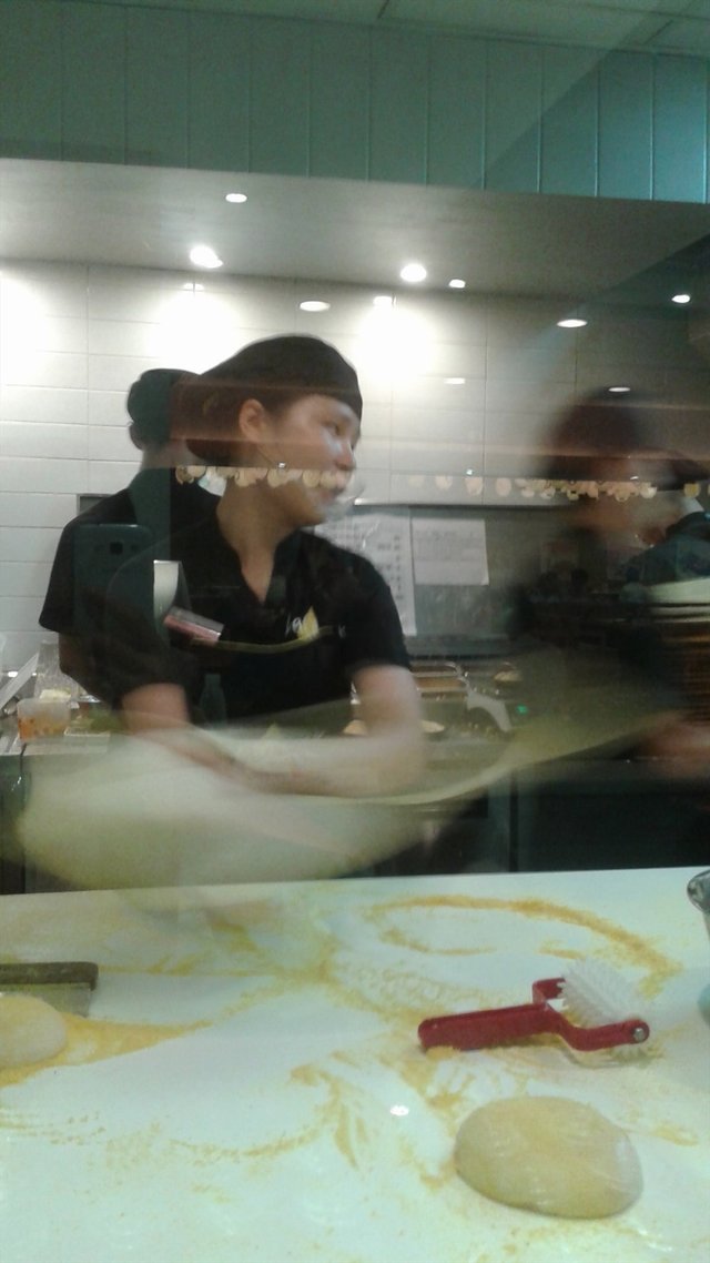 厨房都係开放式,个女店员正系度抛紧饼底。