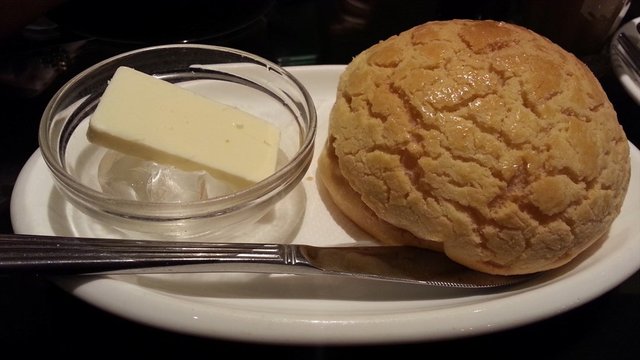 菠萝油(10元):一个酥皮中间横着切开,旁边还有一块牛油,吃的时候将牛油放入菠萝包(酥皮)中,用刀压扁之后就可以吃用,味道跟hk有点点出入。