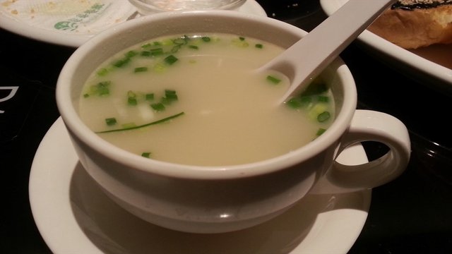 例汤:这碗例汤淡而无味,上面撒有一些葱粒。
