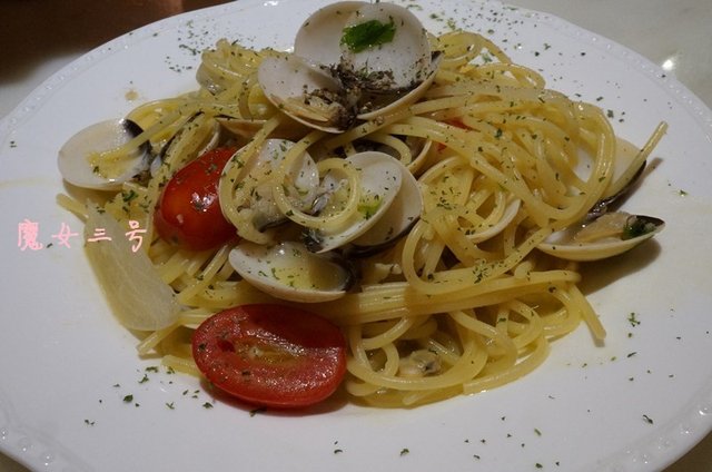 蛤蜊白葡萄酒意面,之前在苏梅的时候吃过白葡萄酒煮青口,感觉味道很搭,特别是海鲜与白葡萄酒的搭配带出海鲜的清甜,而且能祛除腥味。因此在菜牌上看到这个这个搭配就毫不犹豫点了。 新鲜的蛤蜊,白洋葱、大蒜、黑胡椒碎、小番茄等等的配料,当然少不了最重要的白葡萄酒,味道果然没有令我失望。意面吸足了蛤蜊和白葡萄酒混合出来鲜美的汤汁,将味道发挥到极致。
