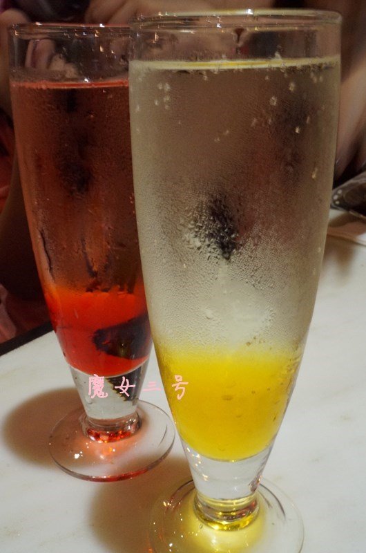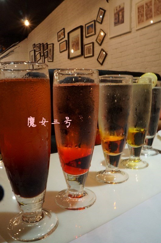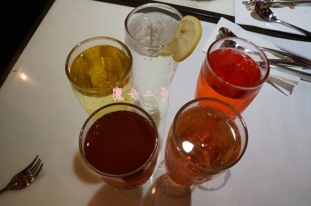 五杯不同口味的苏打水,分别有覆盆子、草莓、红橙、芒果、水蜜桃口味。淡淡的甜味,小清新的感觉,刚好可以缓冲一下口感。其实苏打水还有美容的功效,有抗氧化作用,有助于增进食欲、预防皮肤老化、美容养颜喔。