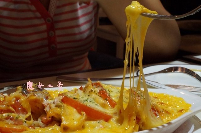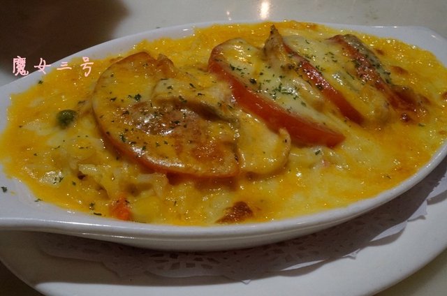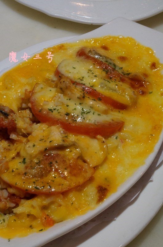 三文鱼茄汁芝士焗饭,金黄色诱人的芝士上点缀着红色的西红柿,芝士味浓郁,三文鱼切得比较小粒,隐藏在米饭之中,偷偷地溜入口内。