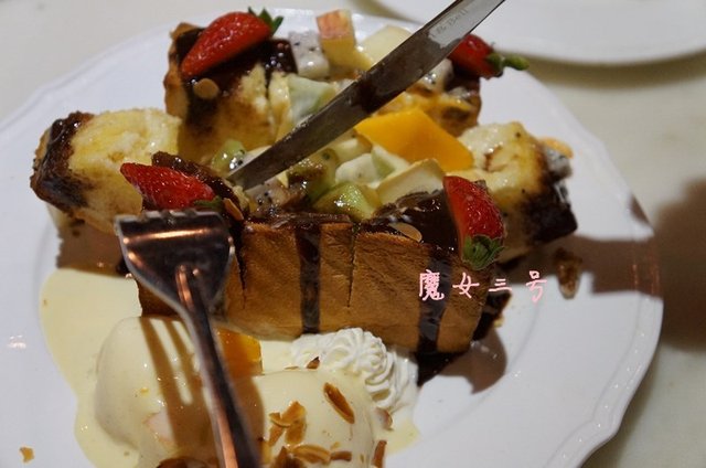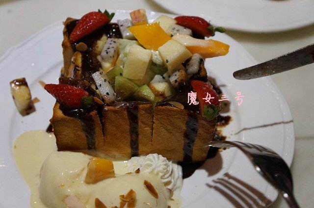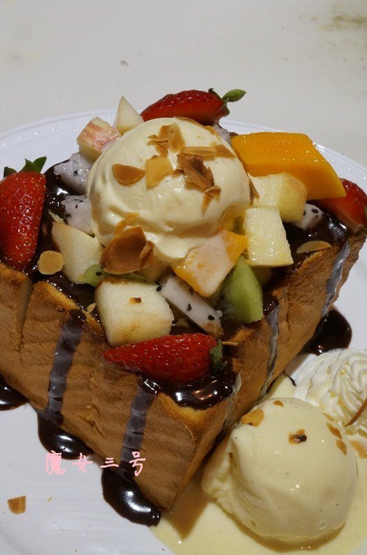 热带水果冰淇淋吐司,混合了各种口味的水果和冰淇淋,看上去就像百宝盒,吐司切开后,里头的吐司片还是热的,搭配外面的冰淇淋吃,一冷一热的感觉在嘴里慢慢交融。吐司的表皮烤得也很脆,而且是咸吐司,咸甜中和,令人更有食欲。