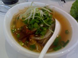 顺化牛肉檬 这个菜原产于越南顺化,在越南中部地区非常受欢迎,它的汤底的肉汤用牛骨、发酵虾酱、香茅、干红辣椒制成。吃的时候还要加入薄荷叶、豆芽、柠檬、切碎的蕹菜等一大段配料,实在复杂。很大碗,吃起来口感很特别。