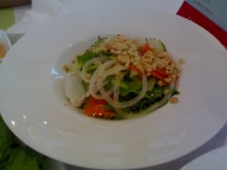 越式鱿鱼圈腌青瓜沙律 是把整只大鱿鱼切成圈,配上腌制的黄瓜片、鲜薄荷叶沙律、洋葱圈,沾着鱼露吃,黄瓜的清脆、薄荷叶的清新、洋葱的辛辣、鱿鱼的清甜,涌上你的舌尖。