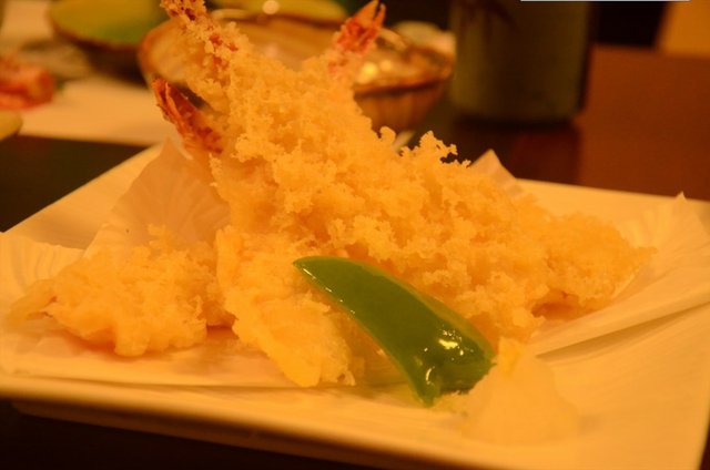 里面的虾是九节虾,口感吃起来脆脆的。必须搭配天妇罗汁吃,否则没什么味道。